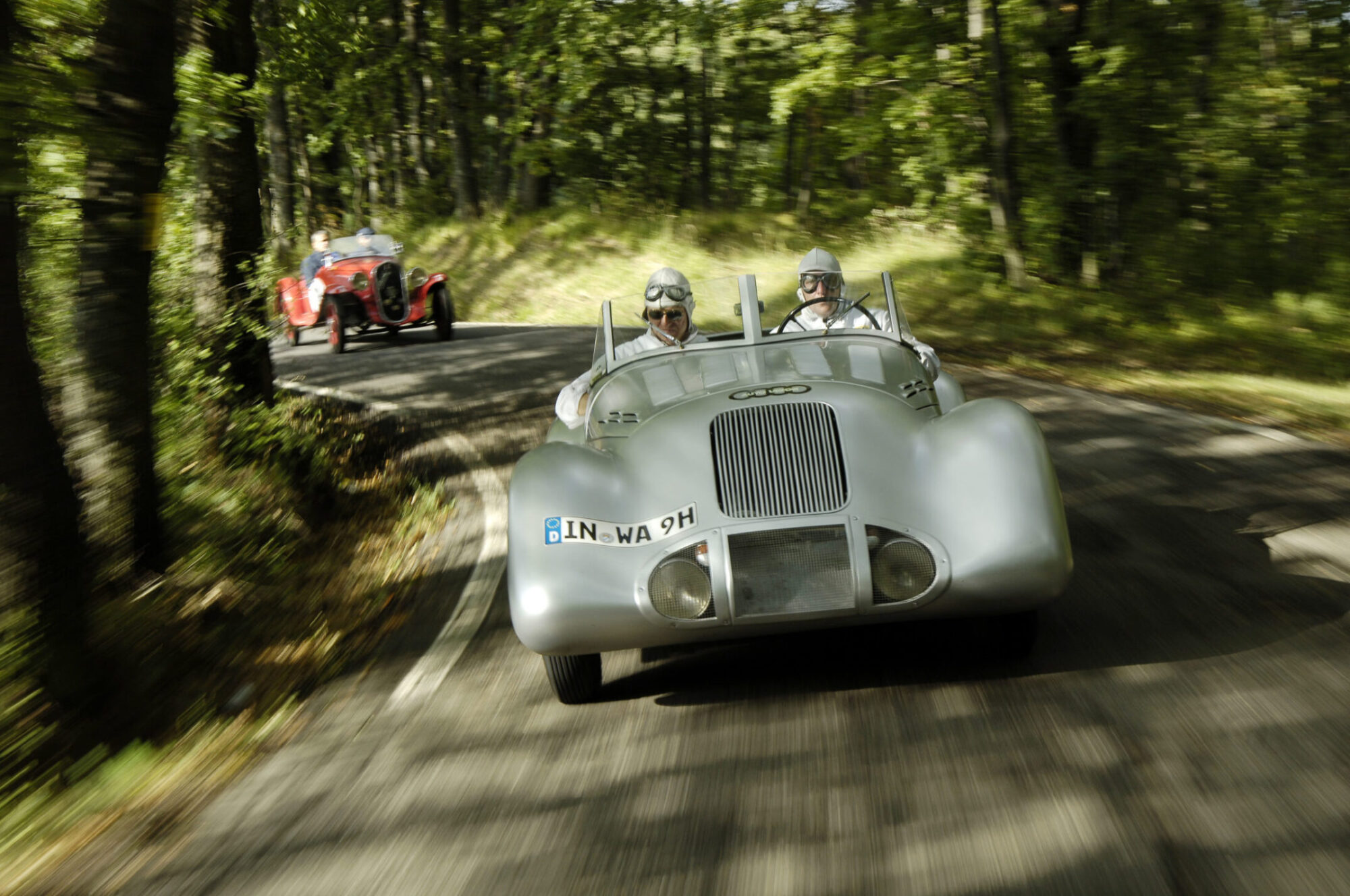 Audi Tradition in an Auto Union Silver Arrow at the silver jubi