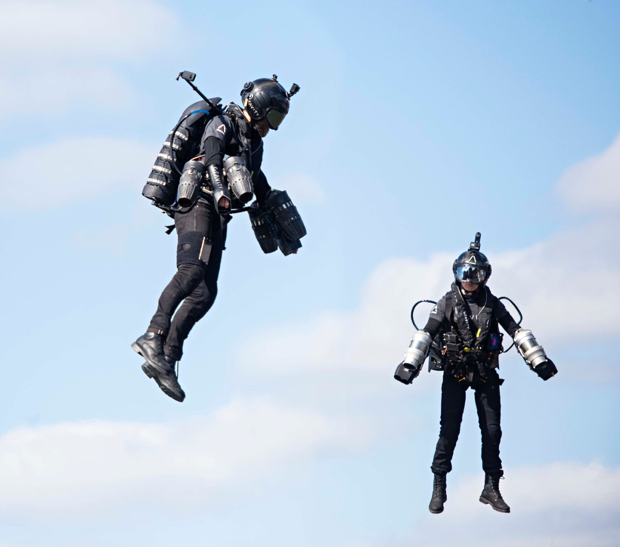 Real life Iron Man and Inventor, RICHARD BROWNING (40) (left) flying across Brayford Pool in Lincoln, UK with stunt man JAMIE STANLEY (22 ) (right) using jet powered suit, created by BROWNING’S company Gravity Industries.